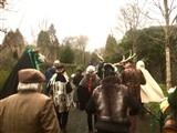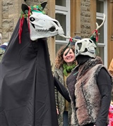 The event highlighted many of the creative talents in West Malvern. It began with singing at the pub, led by West Malvern Voices. Then the rowdy ‘Guisers’ arrived, wearing the most fantastical animal headgear, including a large horse with a hinged and very expressive working jaw and a Green Man. They forced a noisy entrance to the pub, harassing drinkers and demanding free food and drink – a request robustly denied by Kim! There was a brief exchange between Kim and the Green Man, during which she handed him the withered old ‘Wassail wreath’ to be replaced by a new green one at the Wassail and displayed in the Brewers for the next 12 months … until the 2027 Wassail!!